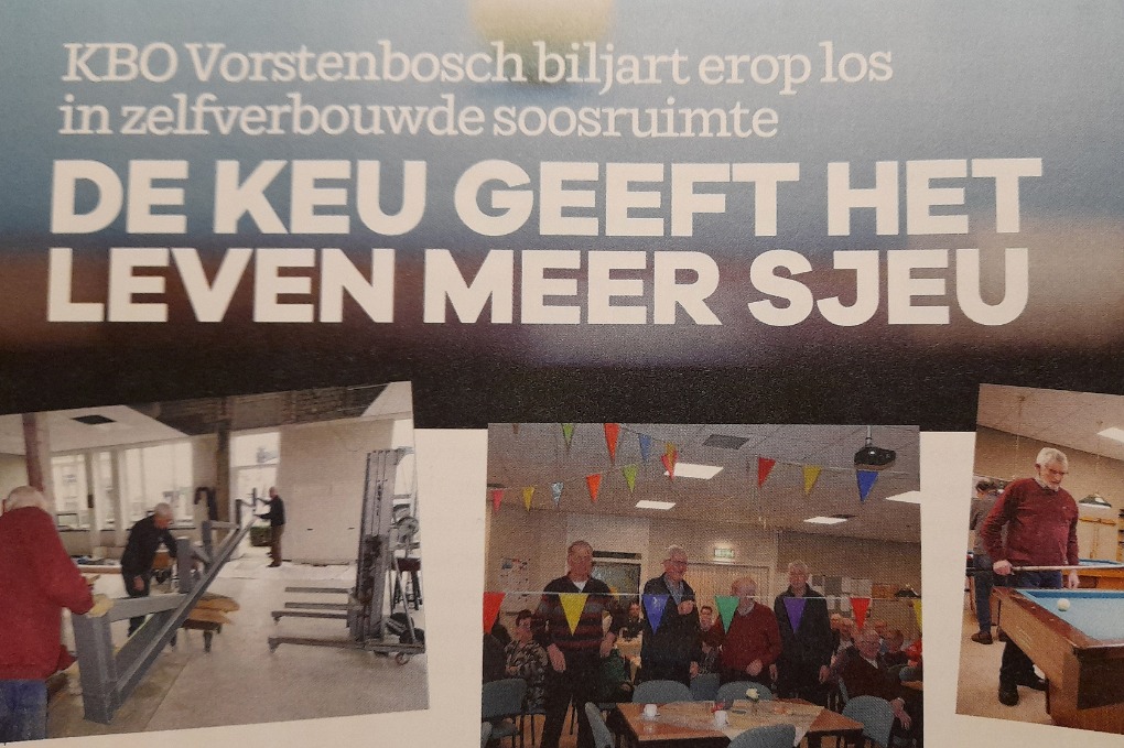 KBO Vorstenbosch biljart er op los in zelf verbouwde soosruimte. ‘DE KEU GEEFT HET LEVEN MEER SJEU’