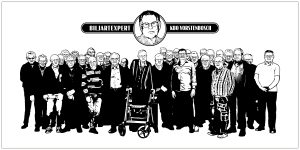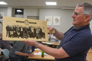 Peter van Hulten vervaardigde het bovenstaande afscheidscadeau voor commissielid Jan van Grunsven: een groepsfoto van de KBO-biljarters, middels een lasermachine op een broodplank gegraveerd.