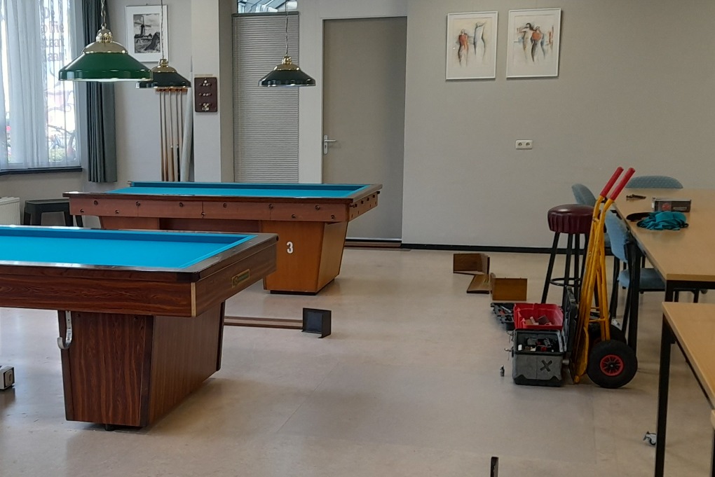 Onlangs is het groot onderhoud aan onze drie biljarts uitgevoerd. Deze grondige aanpak was na 15 jaar dringend nodig. De banden zijn gelijktijdig met de lakens vernieuwd zodat we voorlopig weer vooruit kunnen.