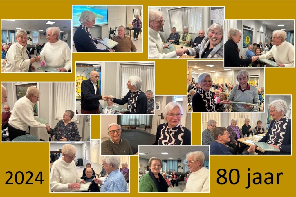 Daarna werden de cadeautjes aan de nieuwe 80-jarigen overhandigd (zie groepsfoto).