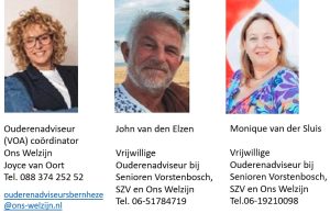 Heeft u vragen, of wilt u graag een bezoek van een vrijwillige ouderenadviseur? Neem dan contact op met de VOA coördinator Joyce van Oort van ONS Welzijn of uit Vorstenbosch John van den Elzen en Monique van der Sluis.
